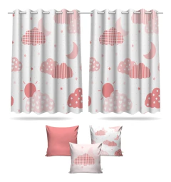Kit Cortina + 3 Capas Almofadas Infantil Nuvem Rosa Mod 04